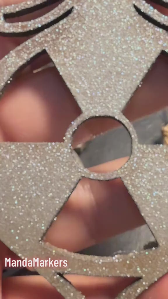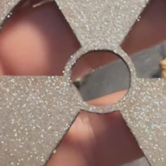 Made out of thick wood, then painted with a metallic silver and sparkles.