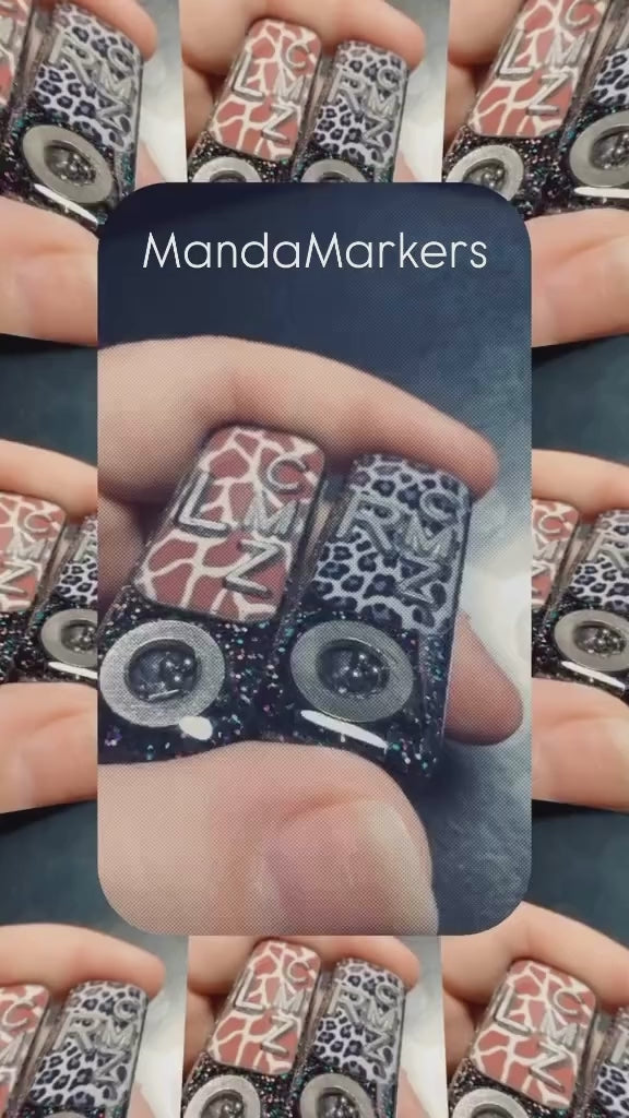 Customize your markers with your choice of lead initials, available for free. These markers come in a set of two and are approximately 2 inches by 0.75 inches in size. Show off your individuality and passion with these personalized markers. The product images will give you a clear idea of how your initials will be placed, whether you choose two or three initials.