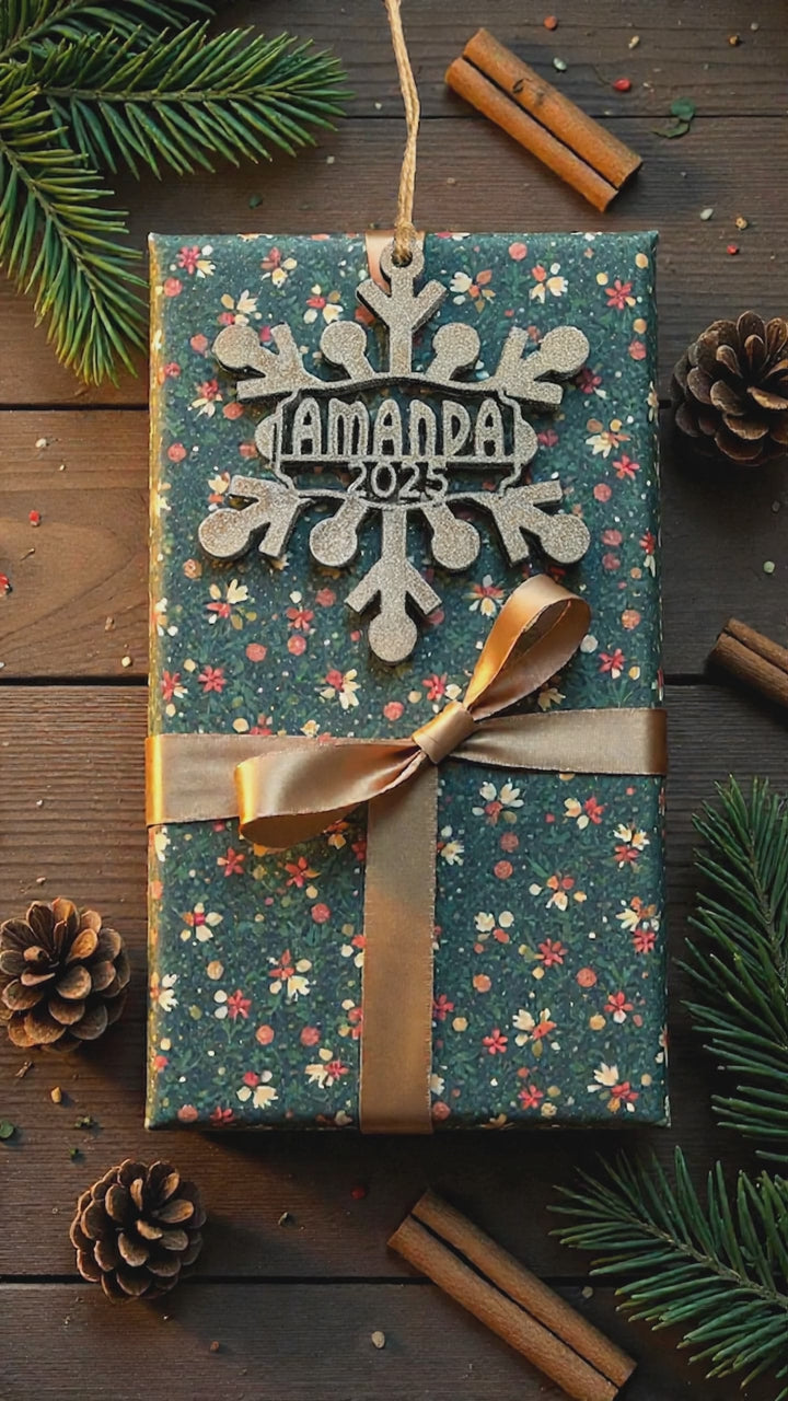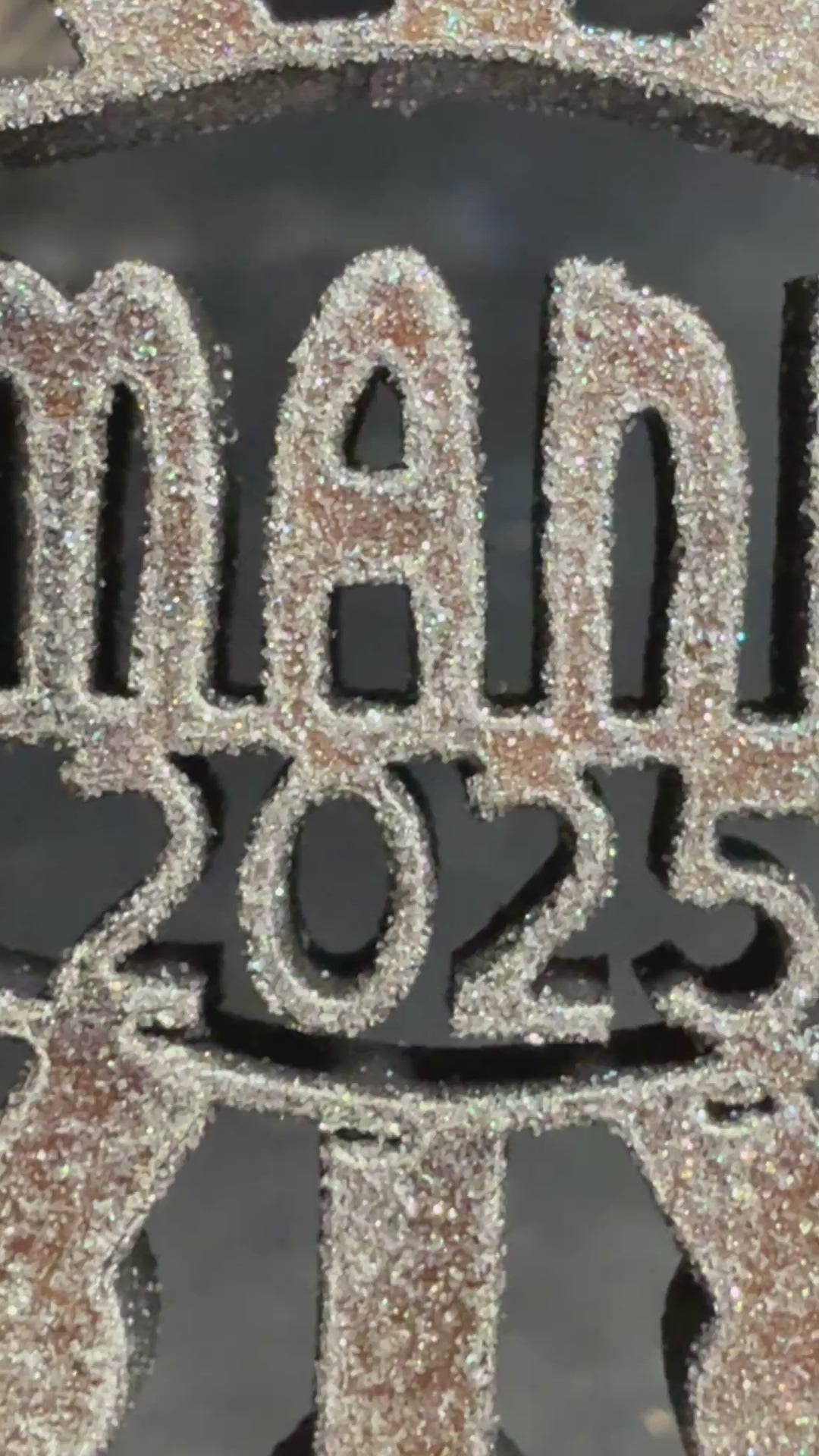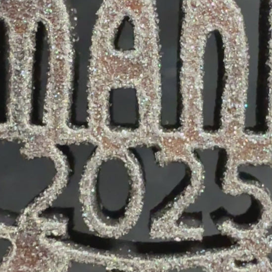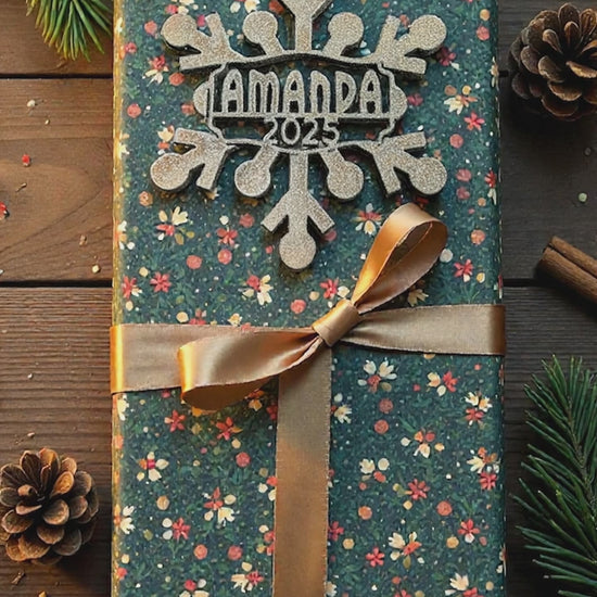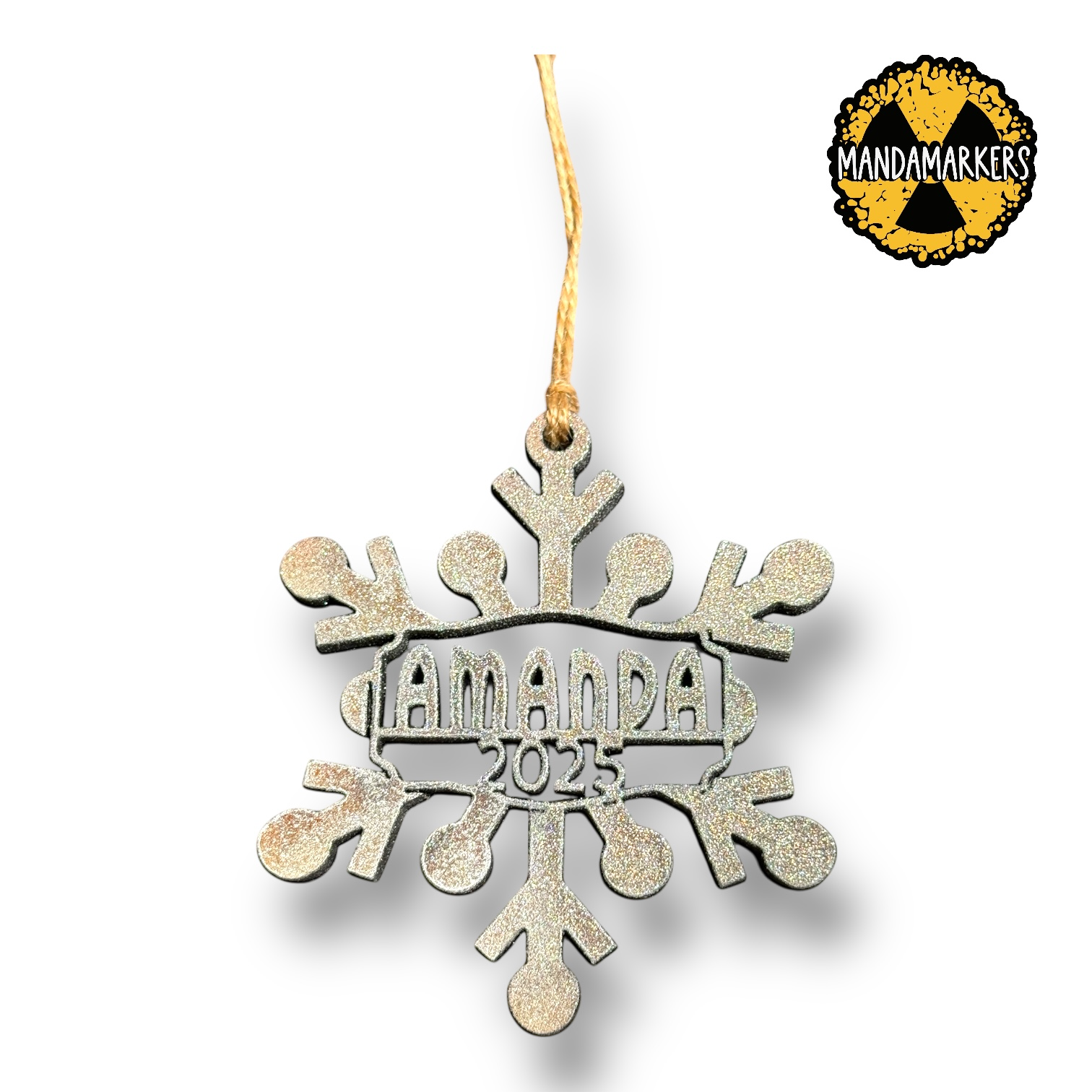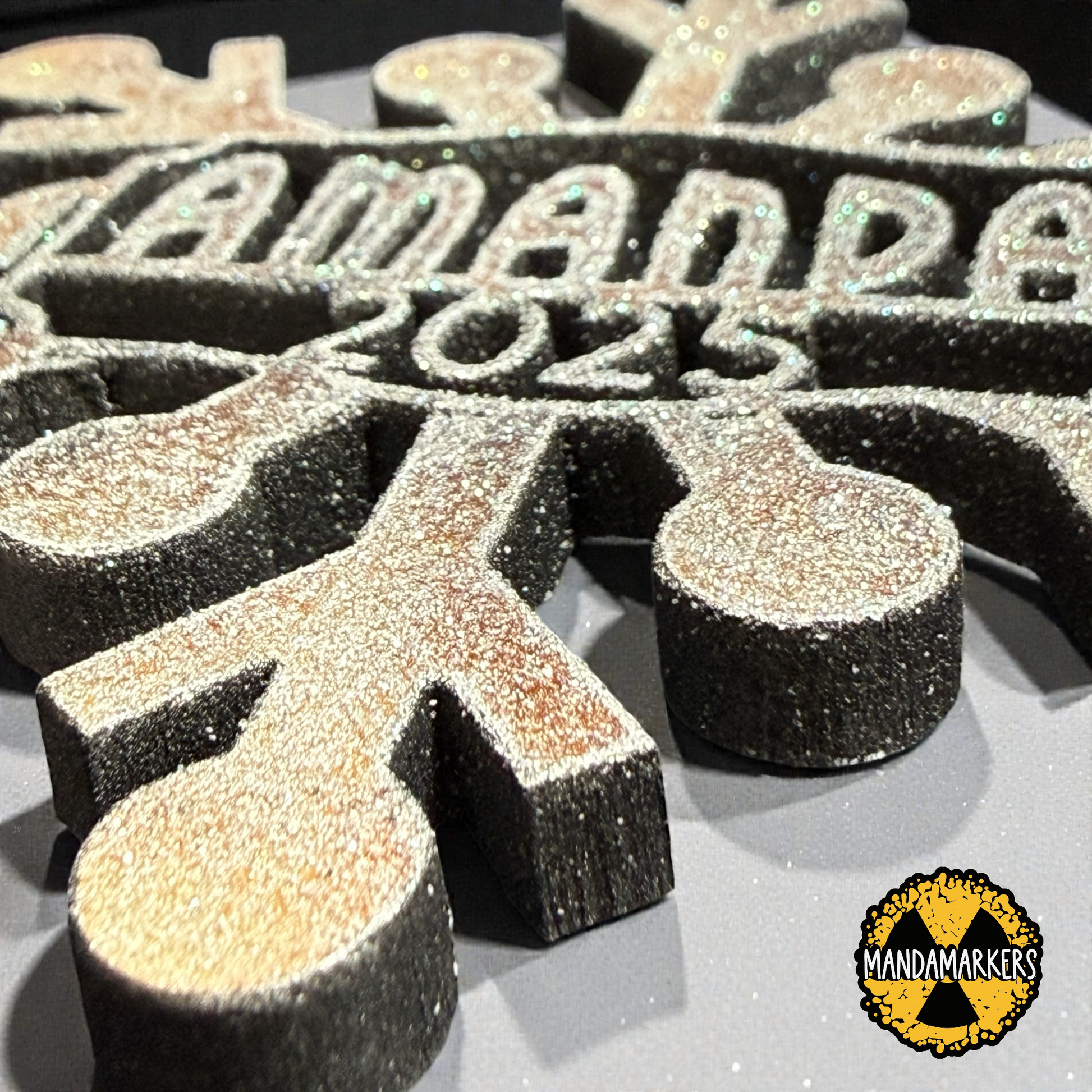 Made out of wood, then painted with a metallic silver and a touch of sparkles. Perfect for employee customizing stockings and gifts.